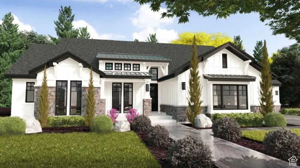 Home Under Construction Modern farmhouse design with a blend of contemporary and rustic elements. The exterior showcases white board and batten siding complemented by stone accents, black-framed windows, and dark roofing. The house has a welcoming entryway with a covered porch and large glass doors. TriCo Construction is the home builder