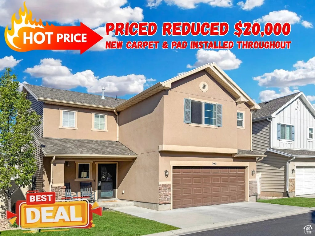 Step into this beautifully appointed home featuring a dramatic two-story great room that fills the space with natural light and creates a stunning first impression. The gourmet kitchen is a chef's dream with elegant white cabinetry, including 42-inch uppers, gleaming granite countertops, stainless steel appliances, and a walk-in pantry for ample storage-plus, the refrigerator is included for your convenience. Brand new carpet and pad were just installed throughout the entire home. Just off the kitchen, you'll find an oversized patio perfect for entertaining, complete with a stylish pergola for year-round enjoyment. Smart home features like a smart thermostat and a video doorbell add modern convenience and peace of mind. Upstairs, all three bedrooms are thoughtfully placed together, including a spacious primary suite with a spa-style bath boasting an oversized garden soaking tub and a generous walk-in closet. The laundry room is also located upstairs for added ease. Enjoy outdoor living in the fully fenced backyard or relax on the welcoming covered front porch that enhances the home's curb appeal. The community offers a plethora of amenities through the HOA, including two sparkling community pools, a clubhouse with a gym room, a hot tub, & several community parks. The HOA takes care of your & your neighbors' front lawns, ensuring your neighborhood always looks pristine. Plus, with a large city park & splash pad blocks away, outdoor fun is always within reach. Convenience is key with this home's location, providing easy access to major highways such as I-15, I-215, & Legacy Parkway, making commuting a breeze. And for outdoor enthusiasts, the Legacy trail system offers miles of biking & walking trails right at your doorstep. With a grocery store & other amenities nearby, everything you need is just moments away. Don't miss out on the opportunity to make this exquisite home yours. Schedule a showing today & start living the life you've always dreamed of!
