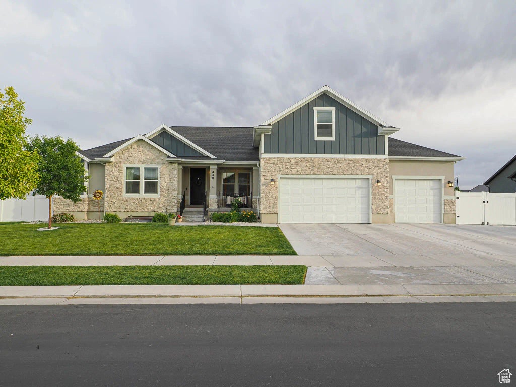 Spacious rambler with open floor-plan, 9' ceilings, and custom stone fireplace. Large kitchen with island and bright dining area. Bonus suite upstairs with game room, bed, and bath. Two bedrooms and a full bath are finished in the basement with room to grow. Enjoy an oversized sports court with basketball hoops and pickle-ball striping, plus RV parking. Custom mudroom shelving and family-friendly layout. Priced to sell!!