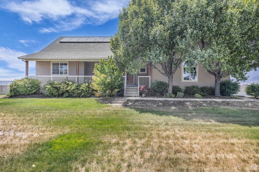 Charming Country Rambler in Eagle Mountain on Nearly an Acre!! This inviting 6-bedroom, 4-bath custom country rambler is nestled on a generous .81-acre lot, offering the perfect blend of comfort, space, and thoughtful updates. Enjoy the open-concept kitchen and family room with vaulted ceilings, a stunning rock fireplace, and rich pine doors that add warmth and character throughout. The well-equipped kitchen features a newer refrigerator, a high-end Bosch dishwasher, and opens to a private deck-ideal for outdoor dining and entertaining. The main level showcases new carpet installed in summer 2024, and the convenience of an included washer and dryer. Retreat to the spacious primary suite, which features a recently updated bathroom with modern finishes-adding a touch of luxury to your daily routine. Upstairs, a generous loft includes 2 bedrooms, a full bath, and makes an ideal guest or flex space. The fully finished basement offers a large family room with a cozy wood stove and plenty of room to relax or entertain. Additional highlights include:New HVAC system installed in 2021, Fully paid-off solar panels (installed in 2016) for energy efficiency, Detached 2-car garage plus storage shed, Fully landscaped yard with drip irrigation for easy maintenance. This is a fantastic opportunity to own a beautiful Eagle Mountain home with abundant storage, and room to spread out-all on an expansive lot perfect for gardening, recreation, or simply enjoying the outdoors. Square footage figures are provided as a courtesy estimate . Buyer is advised to obtain an independent measurement.
