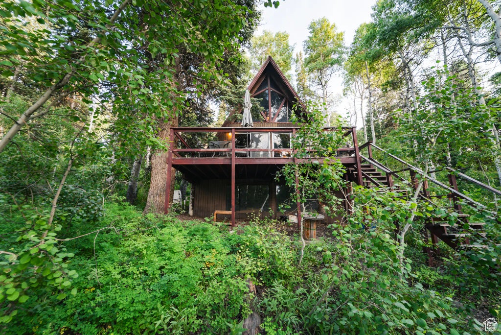 Escape to your own private hideaway in the Timberlakes community of Heber Valley, where the air is crisp, the trees are tall, and time moves just a little slower. This charming A-frame cabin, nestled on a quiet lot surrounded by overgrown pines and aspens, offers 1 bedroom, 1 bathroom, and a cozy loft that comfortably fits a queen bed. While not updated, it holds incredible potential for the dreamer ready to transform it into something truly special. Step onto the sun-warmed deck and feel the world fall away as you take in the sweeping mountain views. Listen to the wind dance through the trees and the soft call of nature surrounding you, it's a place that invites stillness, reflection, and a deep exhale from the everyday rush. Inside, you'll find simple comforts and rustic character: creaking floorboards that tell their own stories, wood-paneled walls, and a space that radiates quiet charm. Whether you're sipping coffee as the morning light filters through the trees or watching the stars from the deck at night, this untouched retreat offers the perfect canvas to create your mountain dream. If you've been searching for a place to unplug, recharge, and reconnect with nature and yourself, this is your invitation.