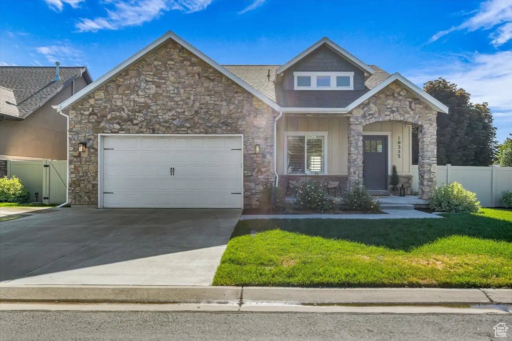 Welcome to your next chapter in the beautifully gated Harvest Crossing community! Step in from the charming front porch and enjoy an airy, open layout with vaulted ceilings, fresh paint, and plantation shutters throughout-perfect for easy living and gatherings alike. Downstairs offers versatile space with a cozy office, spacious family room, and a well-appointed kitchenette-ideal for movie nights, guests, or entertaining. Out back, relax on your brand-new deck and take in peaceful mountain views. Located near top-rated schools, shopping at The District, dining, and year-round recreation, this home truly offers the best of South Jordan living. HVAC systems updated 2021 and radon mitigation system is in place. Remodeled bathrooms, new quartz countertops in bathrooms and kitchen, fridge and oven/range only 1 year old. Recessed lighting added in living area, hallway. and all bedrooms. Don't miss this move-in ready opportunity in a community that blends comfort, convenience, and charm. Square footage figures are provided as a courtesy estimate only and were obtained from county records. Buyer is advised to obtain an independent measurement.
