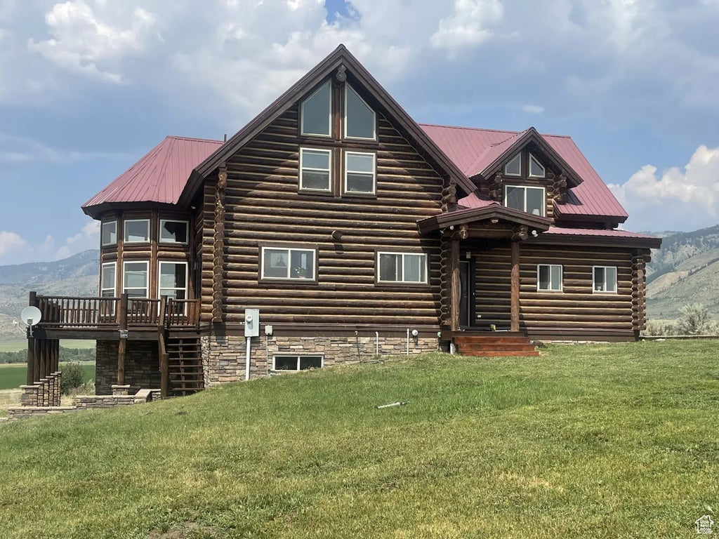 This stunning single family home located at 445 Bennington Canyon Rd in Montpelier, ID was built in 2004 Boasting a picturesque, 360 mountain view, & spacious 4,262 sq.ft. of finished living space spread across three stories. There are 6 bedrooms, 2 full bathrooms, 1 three-quarter bath, 1 half bathroom, office space, great room, family room, loft, formal dining room & walkout basement. Main floor walks out onto a wrap-around deck perfect for summer BBQs. New kitchen appliances & dual water filtration system with updated staining and chinking. The house sits on a sprawling 56.93 acre lot perfect for a hobby farm. Set up as a horse property complete with a enclosed hay barn, out-buildings, fenced pasture, chicken coop, historic water rights and private well, this property offers plenty of room to roam & enjoy the beautiful surroundings. A perfect blend of privacy and luxury, this home is a rare find in the Montpelier area. Comp offered for new carpet makes this a turn-key property.