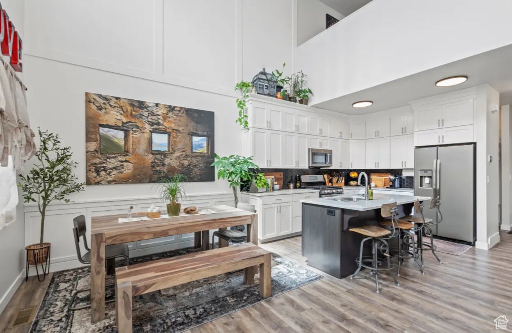 This impeccably maintained and MOVE-IN READY townhome is pure magic! Come see for yourself! The whimsical floor plan lends well to a beautiful dance of sophistication, comfort, and functionality. Enter through the front door into a great room with soaring 18-foot ceilings, thoughtfully designed accent walls, added LED recessed lighting, and striking twin chandeliers that create so much sparkle. Your new kitchen takes center stage with its custom tile backsplash, double-stacked soft-close cabinets, tons of prep space, gorgeous quartz countertops, a gas range, a matching refrigerator, and LVP flooring throughout. This main floor also includes a convenient powder bath, basement access, and direct entry to the spacious two-car garage. Up a winding stairway, you will find your own private retreat! A versatile loft space and a gorgeous primary suite with raised dual-sink granite vanity, a custom-tile shower with a Euro glass enclosure, added overhead rain shower, and a walk-in closet. Both the loft and the bedroom are pre-wired and framed for adding ceiling fans. On the third level - up another fun set of stairs - you will find three additional bedrooms, a full bathroom with granite and cultured marble finishes, a linen closet, and laundry room with gas dryer connection. Major tech upgrades throughout: WiFi - controlled light switches, smart thermostats, ring doorbell, wifi enabled garage door opener, 50-amp outlet for EV charging, oversized 50-gallon water heater, and two separate furnace and A/C for max comfort and efficiency. The unfinished basement is your blank slate. It is an excellent place for storage, obvious recreational or play space, and if you are ready to design your finishes, it is already partially framed and pre-plumbed for future bath, bedroom, and flex space. Day Ranch subdivision is conveniently located between I-15 and Redwood Road, with schools, parks, trails, and green space, pickleball courts, and dog parks just a short walk away. You will be only minutes from The Point, Bluffdale's exciting new mixed-use development. This home places you in the heart of an already thriving community. Offers with seller financing are welcome. Square footage figures are provided as a courtesy estimate only. Buyer is advised to obtain an independent measurement.