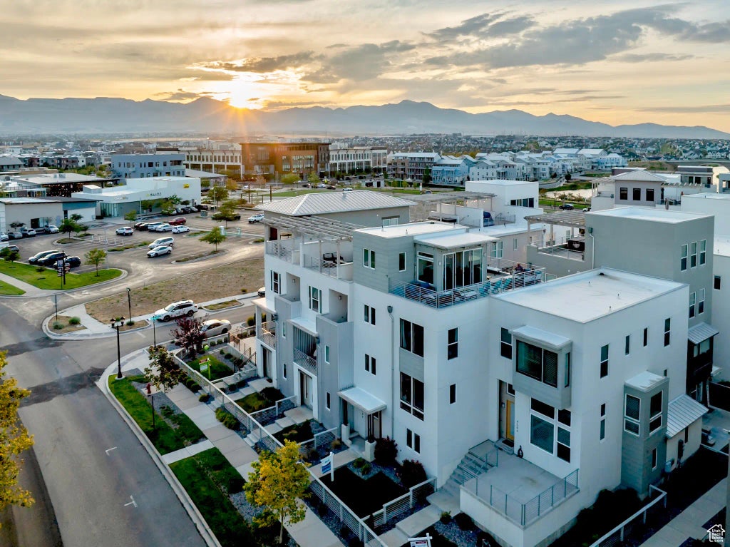 This modern townhome in Daybreak offers stunning views of the Wasatch and East mountains, along with southern views of the valley. Large windows throughout fill the home with natural light, highlighting the open-concept design and custom upgrades. The spacious kitchen and family room feature an extended island, butler's pantry, upgraded countertops, under-cabinet lighting, double oven, gas range, and custom cabinetry. A finished home office with built-in bookshelves, flex room on the ground level, and epoxy-finished garage add versatility, while smart features like zoned HVAC, HDMI wiring, and upgraded window treatments enhance comfort and convenience. The 4th-floor sky terrace is an entertainer's dream, surrounded by windows with a wraparound deck, hot tub, gas line, wet bar and half bath upgrade. Recent updates include a new dishwasher and full water heater system in 2025. Located within walking distance to Soda Row shops, restaurants, lake trails, and the community center, this home offers a rare mix of modern luxury and active lifestyle access in one of South Jordan's most desirable neighborhoods.