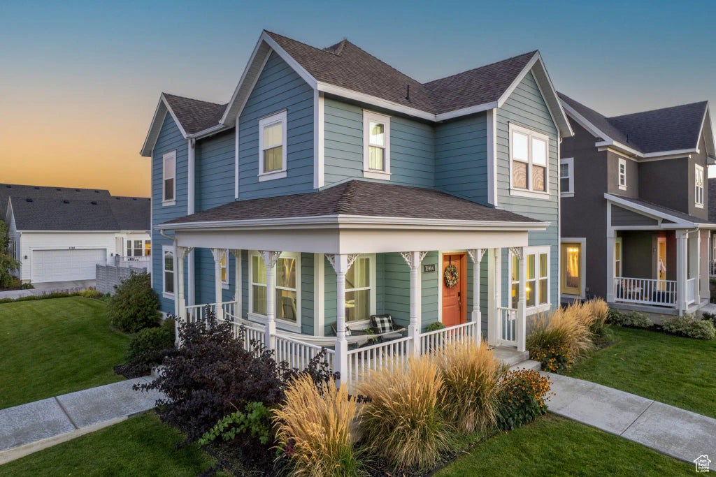 This stunning 4-bedroom, 4-bathroom home is perfectly situated in an amazing Daybreak location, right across from a spacious green area and a short walk to the new Bees ballpark! This classy 2-story home will charm you with its dreamy wrap-around front porch with hammock, interior brick accent walls, arched walkways, and stylish tile floors and surrounds in the bathrooms. Paid off solar panels keep the utility bills low! The large, abundant windows, all fitted with shades or drapes, offer beautiful outdoor views and fill the home with natural light. The kitchen includes all stainless-steel appliances, granite countertops and under-cabinet lighting. The finished basement provides an additional living space with a cozy fireplace, a private bedroom, a full bathroom, a utility room with a sink, and an impressive cold storage area. Upstairs, there are three more bedrooms, including the primary suite with an en-suite bathroom featuring a soaking tub, separate shower, double vanity, enclosed toilet room, and a spacious walk-in closet. The garage impresses with tall ceilings, epoxy floors, overhead storage, and a 50 amp EV charger. Additional upgrades include a whole-house attic fan, a Wi-Fi-enabled garage door opener, and a smart thermostat. Don't miss your chance to love where you live and experience all that the Daybreak lifestyle has to offer. Make sure to check out the 3D tour! All information to be verified by the buyer.