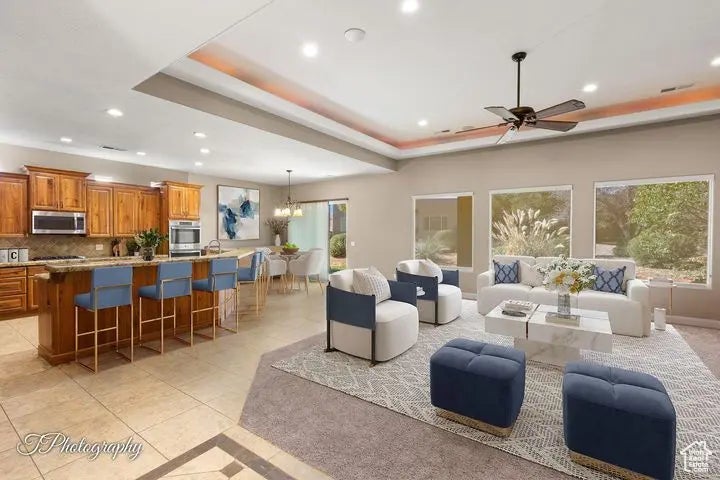 Play area of Southern Utah! Just 5 minutes from Sand Dunes and Sand Hollow State Park for boating, fishing, and swimming. Enjoy discounts on golfing and clubhouse services. Spacious open home with charming courtyard entrance. Separate guest quarters with private entrance, sink, fridge, and bath. Thoroughly upgraded with gourmet kitchen, custom cabinets, granite counters, stainless appliances, backsplash, hidden pantry, large island, gas fireplace, inset lighting, and speakers. Tile throughout. Large primary suite with dual sinks, soaking tub, shower, walk-in closet, and its own thermostat. Tankless water heater, dual fuel heat pump, in-floor heating (not activated). Lush backyard with covered patio, BBQ hookup. Great amenities: pools, racquetball, clubhouse, and 9' garage door.