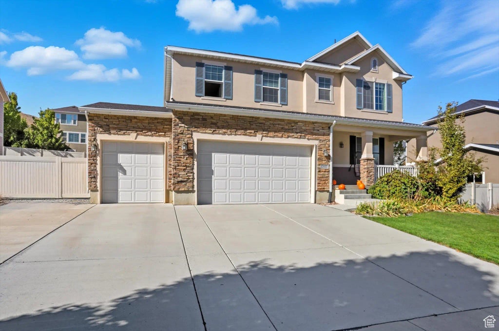 This stunning 6-bedroom, 3.5-bath home offers a perfect blend of comfort and functionality. Features include a water softener, in-ground trampoline, and a fully finished 3-car garage with built-in shelving. The gourmet kitchen boasts granite countertops, stainless appliances, and optional double ovens, perfect for entertaining. The spacious master bath has a jetted tub and double sinks, complemented by a guest bath with double sinks. Upstairs, enjoy a loft, laundry room, and front den with French doors. The fully landscaped front and back yards feature mature trees, including fruit and evergreens, garden boxes, retaining wall, and excellent views of lake and mountains. The fireplace adds cozy charm. The basement is fully finished with cold storage. High 9-foot ceilings, fiber internet, and an ideal layout make this home perfect for large families. Schools and friendly neighbors complete this exceptional package.