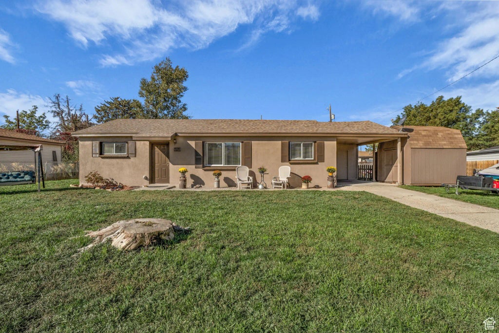 Charming east-facing rambler featuring fresh interior and exterior paint, new blinds, and a new dishwasher. This home offers a large, fully fenced front and backyard with a hot tub for your relaxation. Car port and plenty of parking for extra vehicles and toys, also included is a large spacious storage shed. Schedule a showing today!